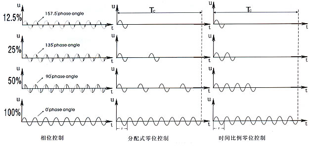綜觀國內外可控硅電力控制器產品,控制模式無非就是兩種:相位控制和零位控制(分配式零位控制、時間比例零控制)。三者之間的比較請看以下圖表。